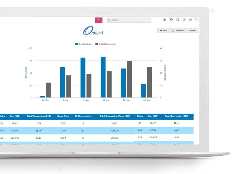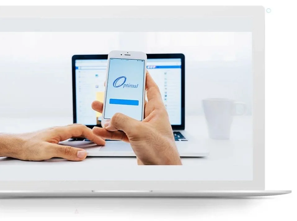 Person holding a smartphone with an app that says 'Optimal'; laptop, coffee mug, and blurred desktop in background on a white desk.