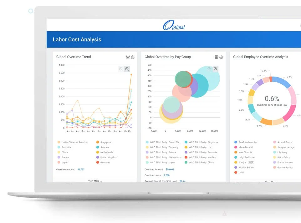 Laptop screen displaying labor cost analysis charts, including global overtime trend, pay group comparison, and employee overtime analysis.